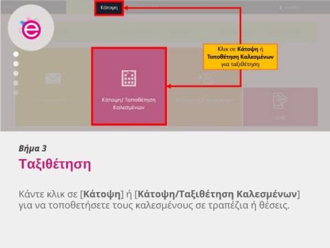 Βήμα 3 Ταξιθέτηση Κάντε κλικ σε [Κάτοψη] ή [Κάτοψη/Ταξιθέτηση Καλεσμένων] για να τοποθετήσετε τους καλεσμένους σε τραπέζια ή θέσεις.