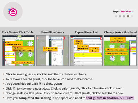 Change seats via side panel. Click on table, click to select guests, click to seat them anew.